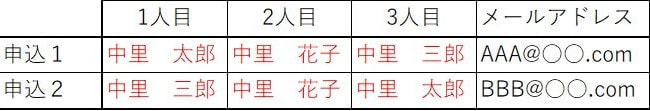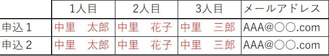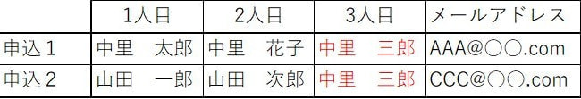 別口の申込に一人だけ重複して申込している(同姓同名はその他の申込情報等を参考にして判断します)